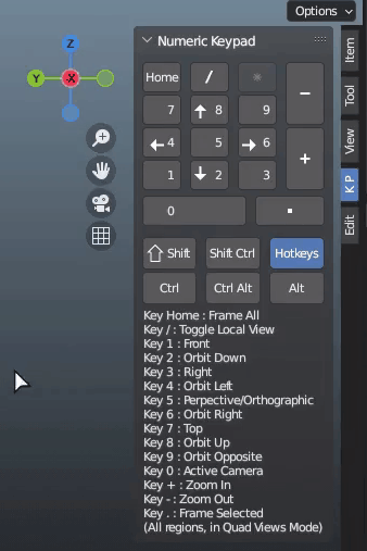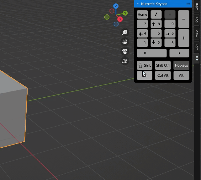 This Add-on simulates a Numeric Keypad for Blender, with all necessary shortcut and modification keys. It is especially useful for those who use Notebooks. There is a button that shows a list of each shortcut enabled by the keys: Shift, Ctrl, Alt and combinations. In the addon's preferences panel, there is a button that changes the color of the icons between light or dark theme, to better contrast with your preferred theme.