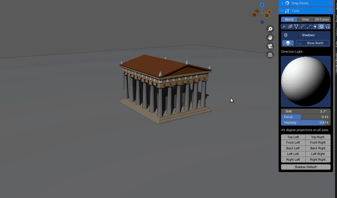 3) Shadows Panel: I had added to the Shadows panel two buttons that projected shadows at 45º degrees, but only one of them worked effectively, as the other projected the shadow from bottom to top (?). Now, I managed to create buttons that cast shadows at 45 degrees in all views (except the Bottom view), both from left to right and vice versa. There are ten buttons in total.